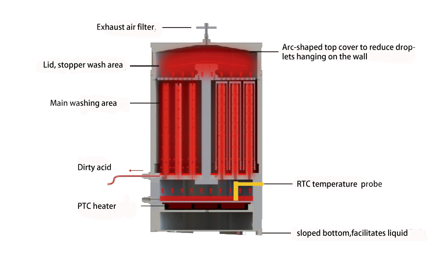 The acid cleaner is also known as Acid Steam Cleaning System or Trace Cleaning System. It uses acid vapor to clean the vessels in a sealed chamber. Through a built-in temperature-control heating system, all trace metal contaminants that are soluble in acid can be safely and efficiently removed by acid vapor. The used acid will then be drained from the chamber to prevent the extracted contaminants from being reintroduced to the cleaned vessels.